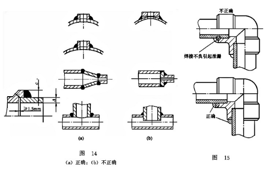管接頭、鋼管及銅管等硬性管需要焊接連接時,如果焊接不良,焊接處出現(xiàn)氣孔、裂紋和夾渣等焊接缺陷,會引起焊接處漏油;另外,雖然焊接較好,但焊接處的形狀處理不當,用一段時間后也會產(chǎn)生焊接處的松脫,造成漏油,如圖14和圖15所示。