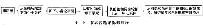 ⑤拆卸液壓泵時(shí),先用專用工具取下8個(gè)螺栓,再用木棒敲擊轉(zhuǎn)動(dòng)軸軸頭,便可分解齒輪泵。注意撞擊主動(dòng)軸時(shí)不要用力過(guò)大,輕輕敲擊,多敲幾次。拆卸順序如圖E所示。